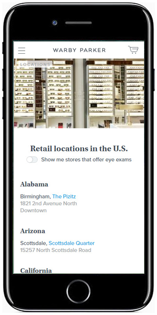 Warby Parker非常了解自己的客戶,將網(wǎng)站的地址頁針對(duì)移動(dòng)端進(jìn)行了優(yōu)化。點(diǎn)擊進(jìn)入具體地址的著陸頁會(huì)看到聯(lián)系信息、交互式地圖、照片以及位置說明。