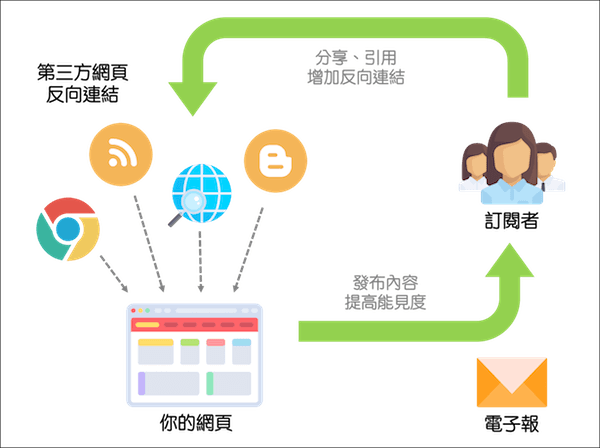 增加反向鏈接:反向鏈接指的是由其他人的網(wǎng)站連到你的網(wǎng)頁的鏈接,反向鏈接的多寡,對SEO 成效有顯著影響,若有來自排序更高或者更多元網(wǎng)站的外部鏈接連向你的網(wǎng)頁,你的網(wǎng)站也會得到越高的SEO 排位。經(jīng)由電子郵件將最新或者整理過后的網(wǎng)站內(nèi)容,發(fā)送給有興趣的訂閱者,若他們透過自己的網(wǎng)站、博客或社交媒體分享或引用你的網(wǎng)站,就能提高你的網(wǎng)頁能見度,并增加反向鏈接的數(shù)量。